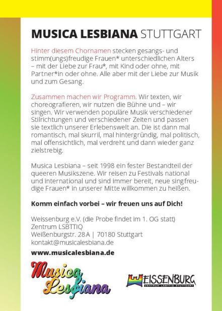 Musica Lesbiana steht zwar klassisch für einen Chor lesbischer Frauen, aber wir sind offen für Sängerinnen* jeder Identität. Die weibliche Stimme zählt, denn wir sind ein Chor mit "Frauenstimmen" - egal ob queer, trans, nonbinär, undefiniert oder Hetera. Die Stimme zählt.
